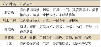 我國人造板主要用于建筑裝飾裝修、家具、地板、門窗、以及包裝材料等領域,詳見表1。其中,我國人造板在家具生產和室內裝飾裝修中的用量占比最大,其余主要用于建筑、包裝和集裝箱底板等。在室內裝修、家具制作領域使用的人造板多為二次加工飾面后的人造板,其中膠合板和細木工板飾面方式主要是油漆和表面貼覆裝飾紙,纖維板飾面方式主要是油漆、表面貼覆裝飾紙和PVC,刨花板飾面方式主要是表面貼覆裝飾紙,而定向刨花板(OSB)主要是直接油漆飾面或表面貼單板后再油漆飾面。