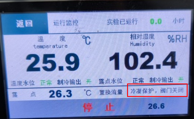 “冷凝保護(hù),閥門(mén)關(guān)閉”:是氣候箱為保護(hù)電子流量計(jì)設(shè)置的一種保護(hù)功能。當(dāng)露點(diǎn)水箱溫度高于15℃時(shí),閥門(mén)控制器關(guān)閉,高露點(diǎn)的水蒸氣無(wú)法通過(guò)閥門(mén)進(jìn)入電子流量計(jì),防止冷凝結(jié)露而損壞電子流量計(jì)。